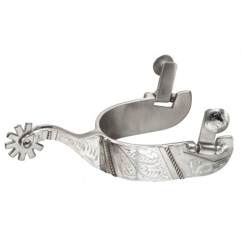 Éperon de reining en acier inoxydable brossé avec motif de butée. Modèle pour femme doté d’une bande de 1 1/8" ornée d’un trim appliqué couleur argent gravé et d’accents en corde. Branche de 2 3/8" avec molette émoussée à 10 pointes de 1 1/4". Effet modéré. Modèle pour femme.